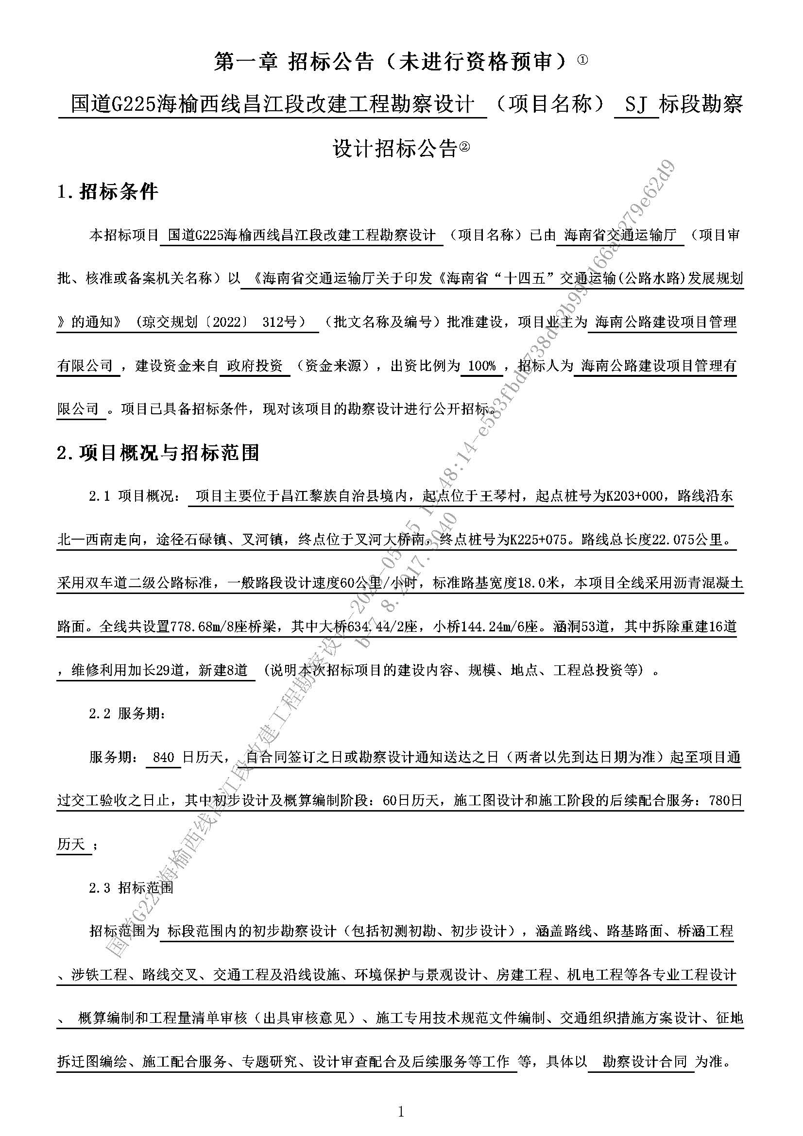 國(guó)道G225海榆西線昌江段改建工程勘察設(shè)計(jì)招標(biāo)公告